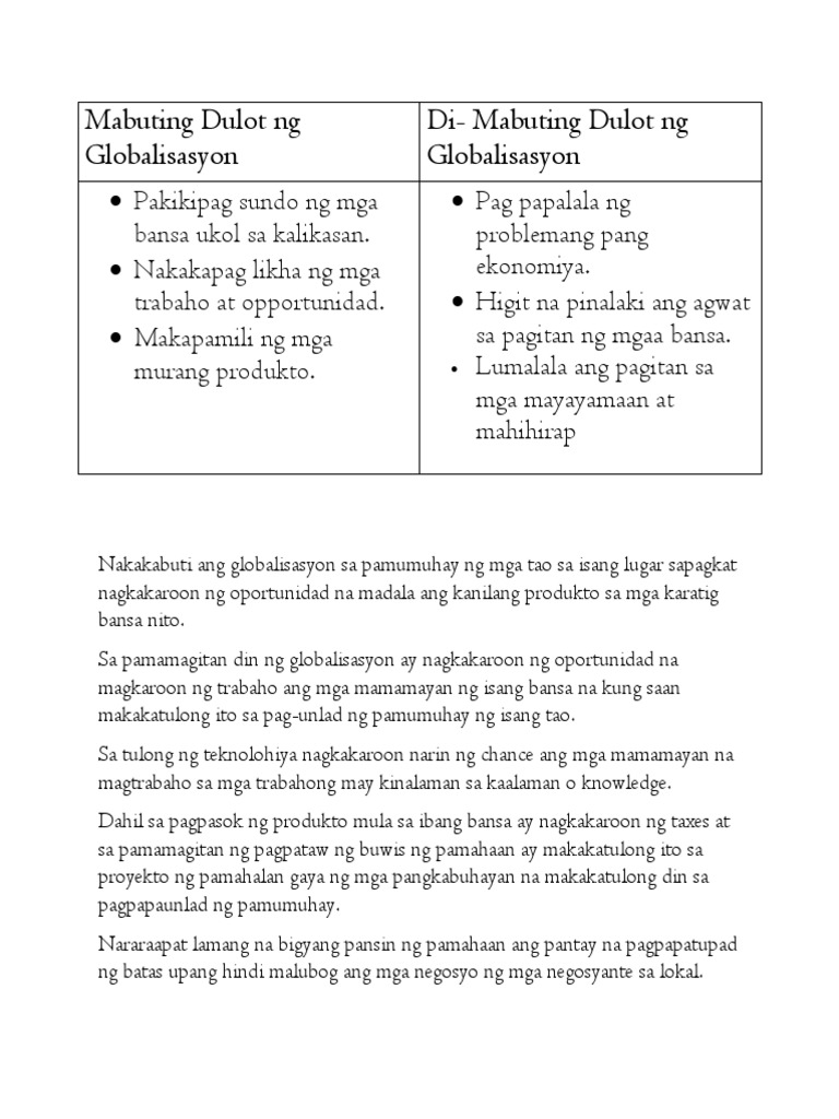 Mabuting Dulot Ng Globalisasyon Di Mabuting Dulot Ng Globalisasyon