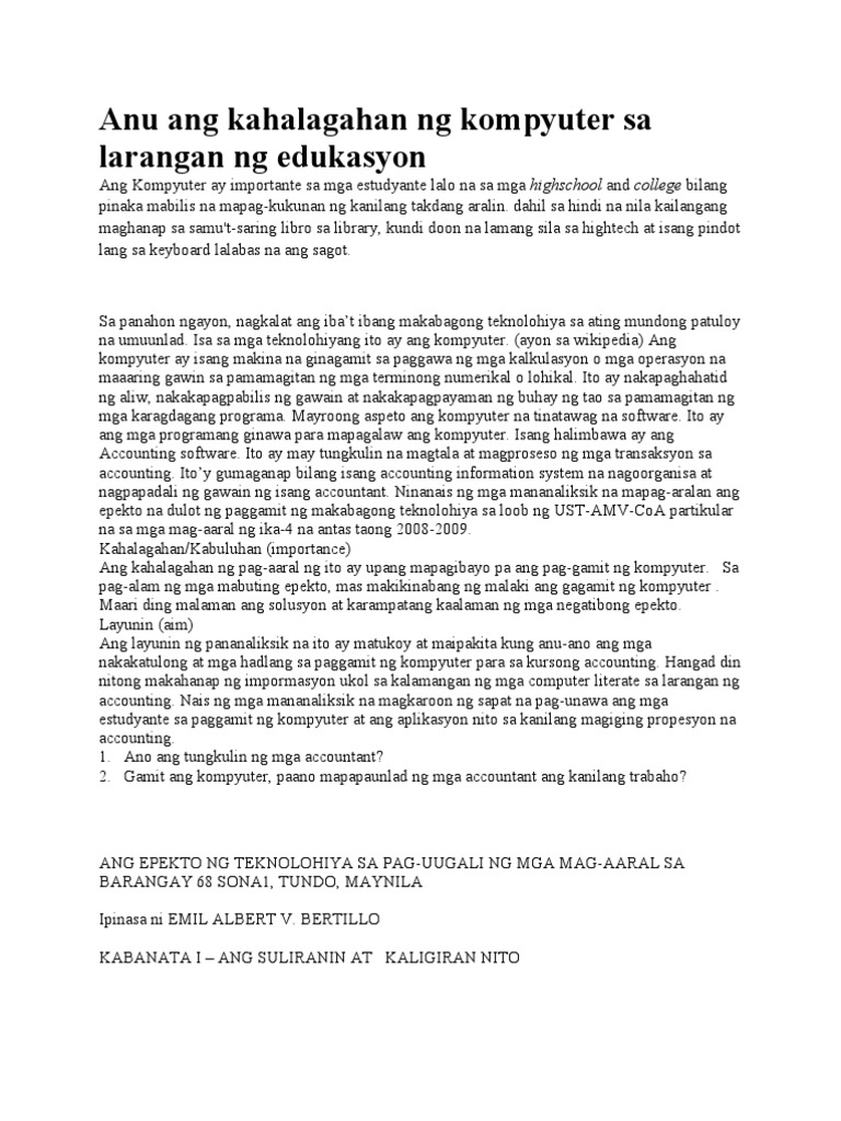 30062017 Ang Teknolohiya ay isa sa pinakaimportanteng mapag-kukuhaan ng impormasyon ng mga magaaral sa panahon ngayon sa pamamagitan ng cellphone laptop computer at projectors. Rizal ay ang kanyang panggagamot sa katarata ng kanyang ina. EPEKTO NG TEKNOLOHIYA SA PAG-AARAL NG MGA MAG-AARAL Isang reserts report na iniharap sa mga dalubguro bilang pangangailangan para sa asignaturang Fil109 ni DONALD COGO KOLEHIYO NG SKSU KALAMANSIG SULTAN KUDARAT ENERO 10 2014 KABANATA 1 PANIMULA Tungkulin ng mga kabataan ang mag-aral kapag ang mga kabataan ay napapagud na sa.