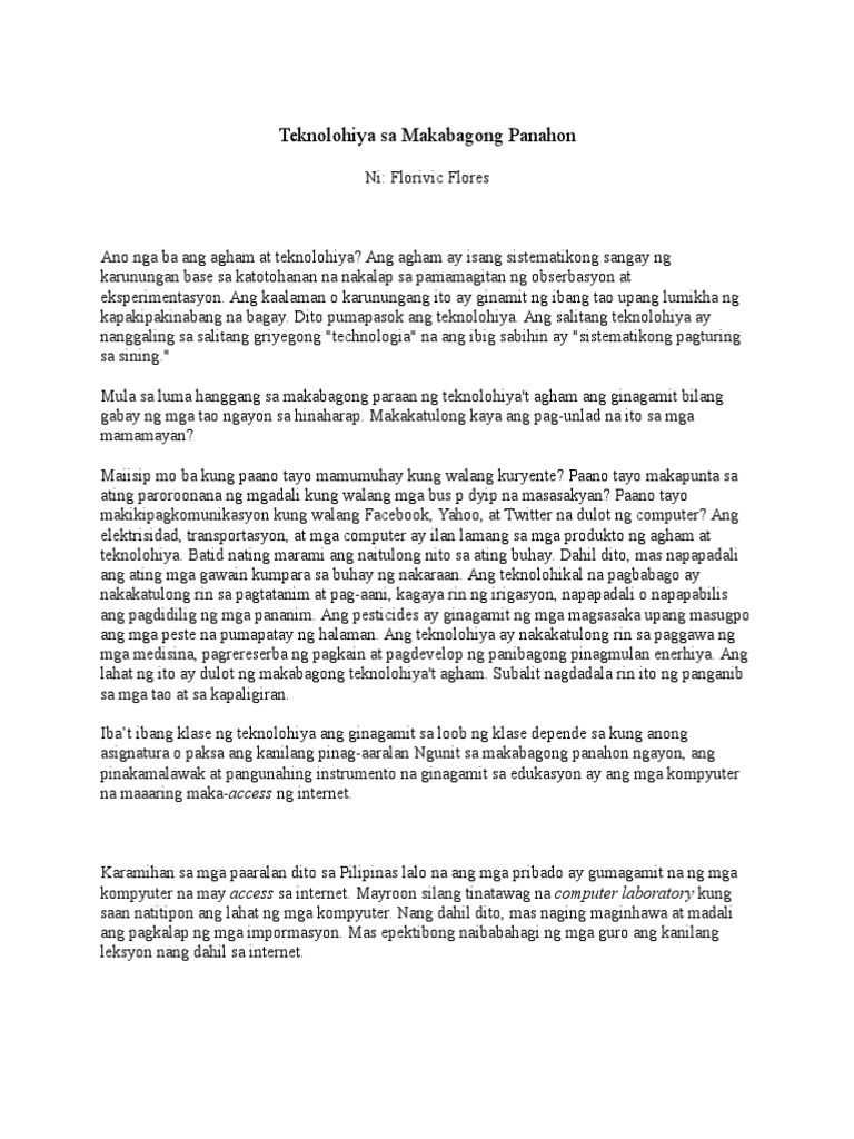 Ang makabagong teknolohiya ay isa ng bahagi ng pang araw-araw na buhay ng isang tao. Itoy mga gamit at makina na maaring tumulong sa ating gawain pagdating sa. Mahalaga pa ba ang wikang Filipino sa kasalukuyan.