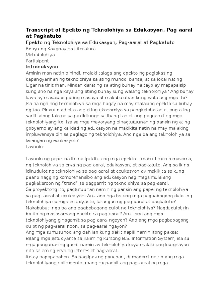 Epekto ng Teknolohiya sa Edukasyon Pag-aaral at Pagkatuto Magbibigay impormasyon sa mga epekto ng teknolohiya sa mag-aaral- mabuti at masama. EPEKTO NG TEKNOLOHIYA SA MGA MAG-AARAL PARTIKULAR SA PAG GAMIT NG MGA SOCIAL MEDIA NETWORKING SITES SA UNANG TAON SA KOLEHIYO Isang Papel Pananaliksik na iniharap sa Klase ng Filipino Sa Ateneo de Naga University Bilang Pagtupad sa Isa sa mga Pangangailangan ng Asignaturang Filipino 2 Pagbasa at Pagsulat Tungo sa Pananaliksik Ipinasa nina. EPEKTO NG MGA MAKABAGONG TEKNOLOHIYA SA BUHAY NG TAO.