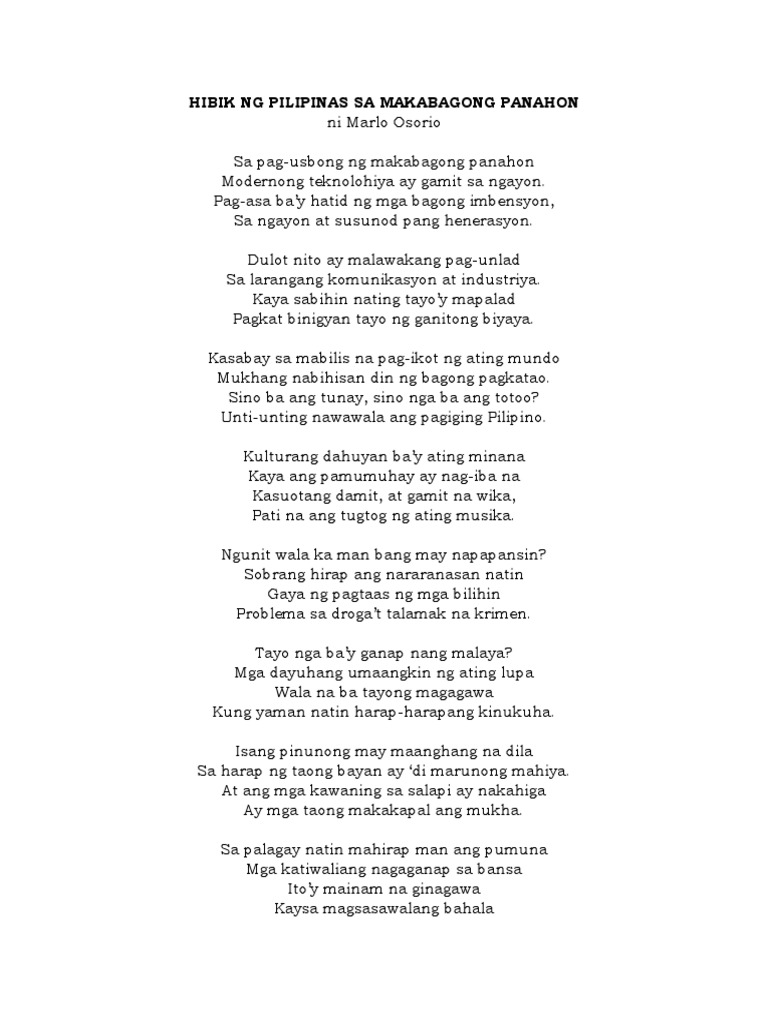 Hibik Ng Pilipinas Sa Makabagong Panahon Tula Ni Marlo C Osorio