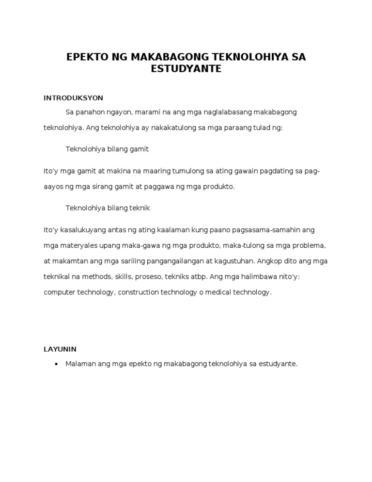 EPEKTO NG TEKNOLOHIYA SA PAG-AARAL NG MGA MAG-AARAL Isang reserts report na iniharap sa mga dalubguro bilang pangangailangan para sa asignaturang Fil109 ni DONALD COGO KOLEHIYO NG SKSU KALAMANSIG SULTAN KUDARAT ENERO 10 2014 KABANATA 1 PANIMULA Tungkulin ng mga kabataan ang mag-aral kapag ang mga kabataan ay napapagud na sa. Maraming naniniwala na ang teknolohiya ay may masamang epekto sa ating lipunan pero marami rin ang pabor sa pag-unlad ng teknolohiya dahil ito ay nagbibigay ng magandang dulot sa pamumuhay ng mga Pilipino. 2832020 Mga Positibong Epekto ng Teknolohiya.